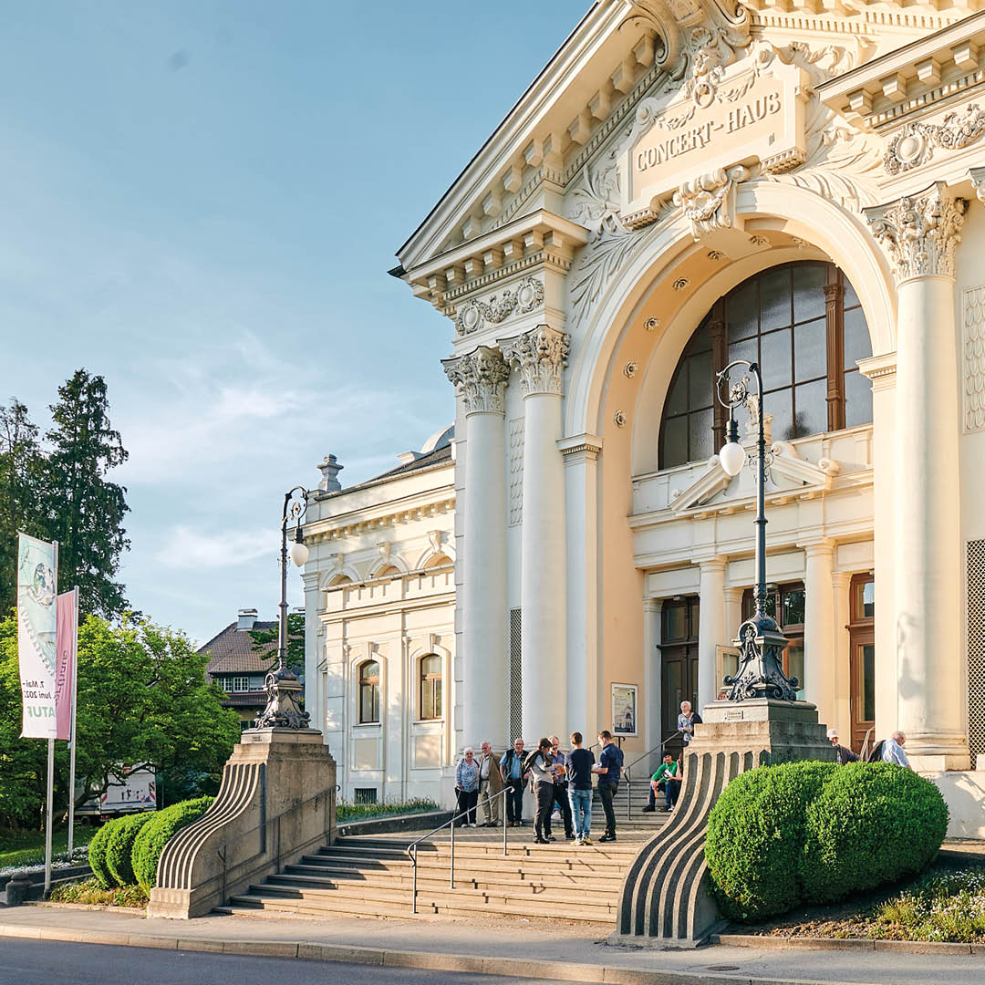 1896/97 wurde das Konzerthaus nach Entwürfen der berühmten Wiener Architekten Helmer & Fellner erbaut, wobei von Anfang an nicht nur an die Nutzung für Theater und Konzerte gedacht war, sondern auch für festliche Vereins- oder Brauchtumsveranstaltungen. Im Inneren befindet sich ein prächtiger, historistischer Theatersaal mit 574 Plätzen. Das Ravensburger Konzerthaus, das seit 1988 unter Denkmalschutz steht, ist ein im gesamten Oberschwaben einzigartiges, repräsentatives Haus.