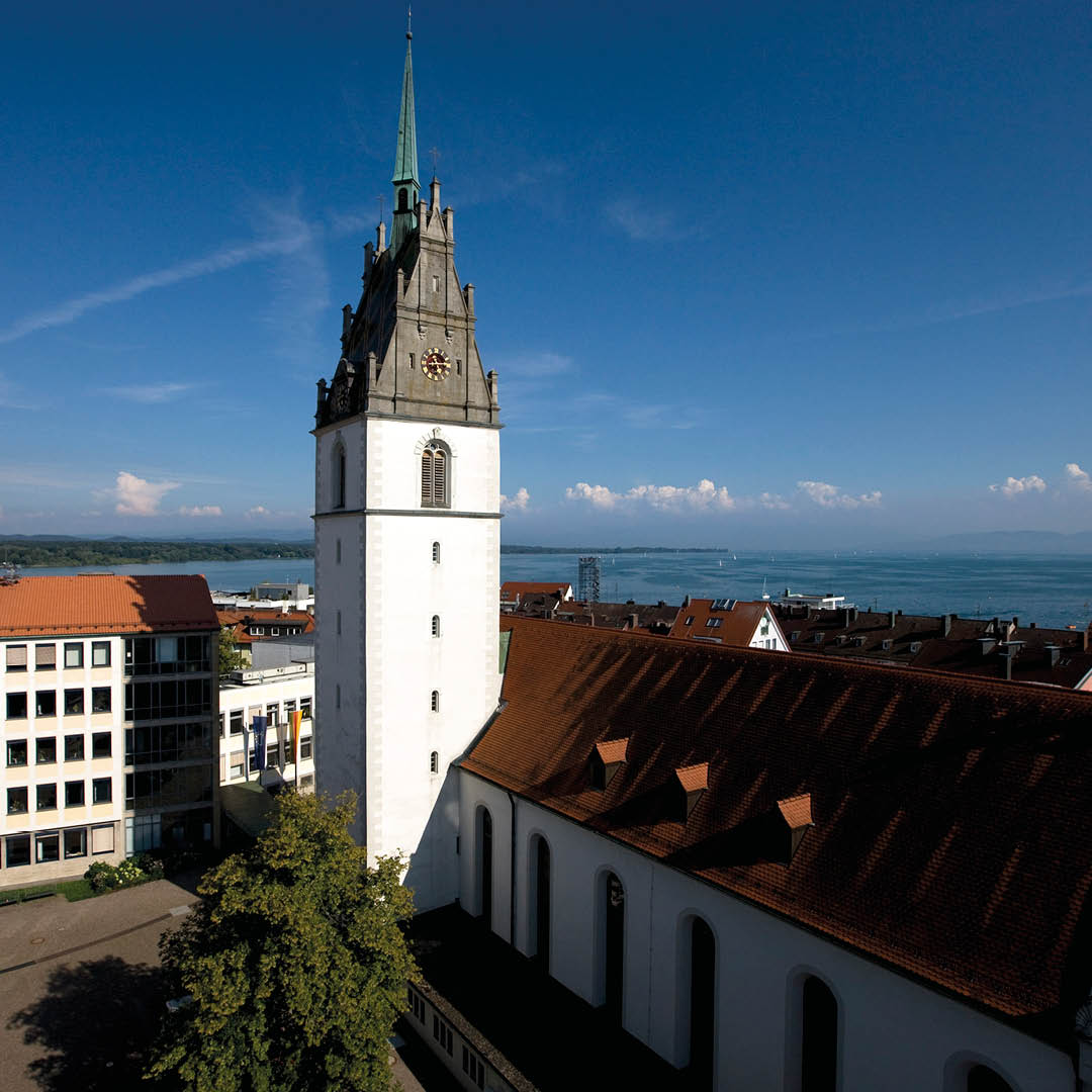 Erstmals 1293 und dann in einer Urkunde vom 26. Mai 1325 wird am Ort, wo sich heute die Nikolauskirche erhebt eine Kapelle erwähnt. Ab 1437 erweiterten die Bürger Buchhorns diese Kapelle, erbauten den hochragenden Turm und einen gotischen Hochchor. Da die Hofener Pfarrkirche im Dreißigjährigen Krieg völlig zerstört wurde, wurde die Nikolauskirche nun Pfarrkirche. 1689 wurde sie erweitert und statt des gotischen Gewölbes erhielten Chor und Schiff eine Flachdecke. Im Laufe des 18. Jh. bekam die Kirche ihre endgültige Form.